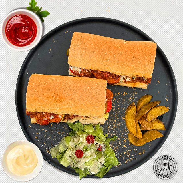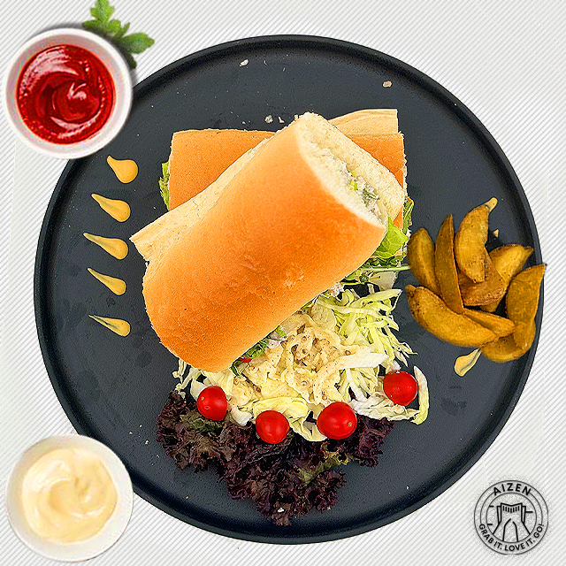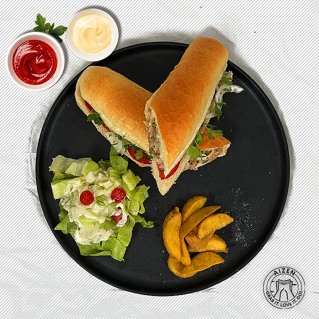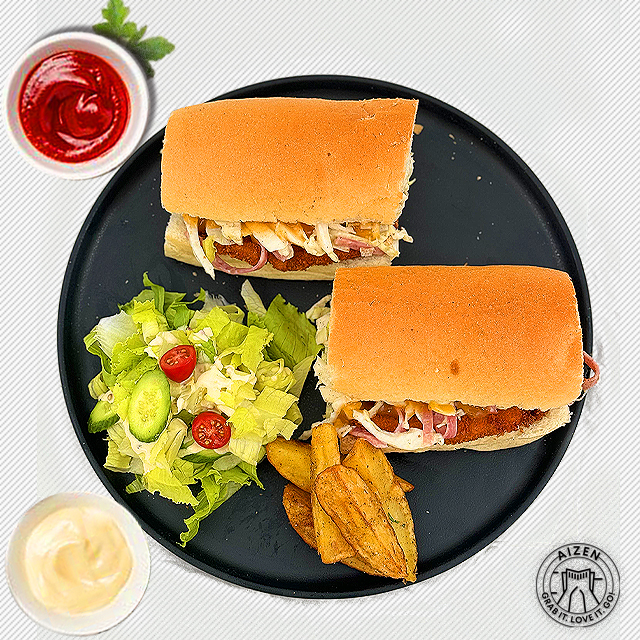 اسلایس فیله مرغ، سس ویژه آیزن، پیازچه، سبزیجات معطر، کاهو، گوجه، خیار ...