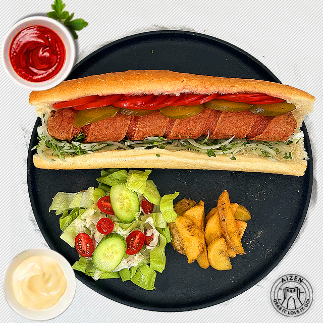 هات داگ مجاری کاله، خیار شور، گوجه، پیاز جعفری + سالاد و سیب زمینی