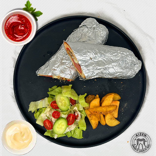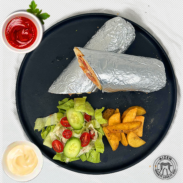 فیله مرغ سوخاری،ژامبون مرغ 90%، سس انبه و عسل، کلم، سس سیر+ سالاد و سی...