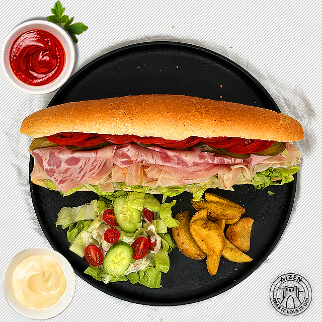 ژامبون 90% گوشت، ژامبون 90% مرغ، گوجه، کاهو + سالاد و سیب زمینی
