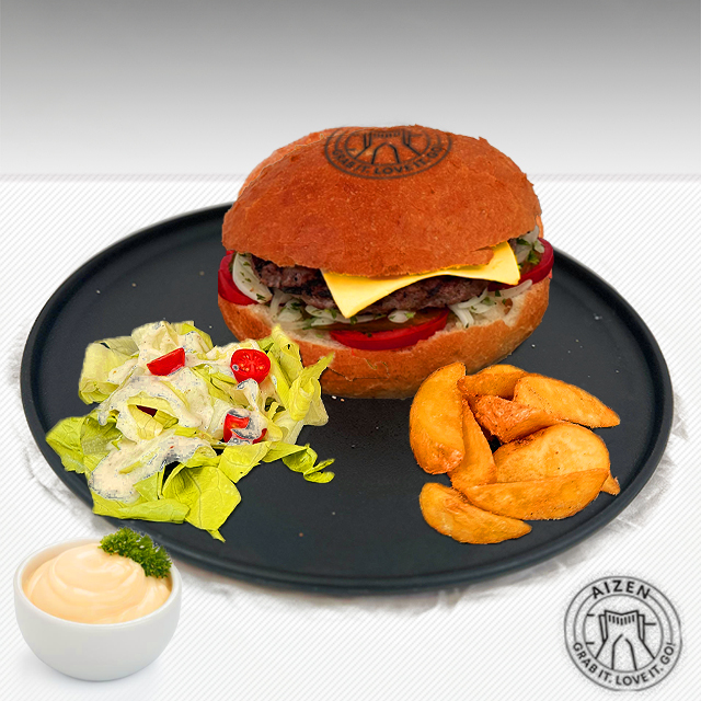 180 گرم ترکیب گوشت گوساله و گوسفند، نان برگر،پنیر گودا، سس آیزن، خیار شور، پیاز جعفری، گوجه + سیب زمینی و سالاد