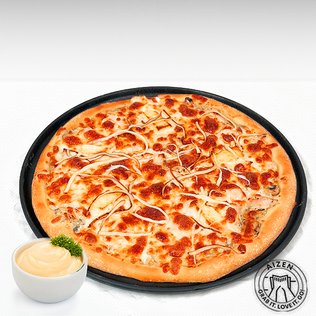 خمیر رومانا استایل 32 سانتی، سس آلفردو، اسلایس سینه مرغ، سس قارچ، پنیر پیتزا، پنیر کبابی، پنیر دودی