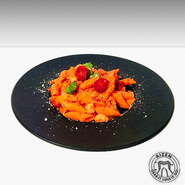 پاستا پنه،بیکن، پیاز، گوجه، اسلایس فیله مرغ، سس قارچ و خامه، پنیر پارمسان، سس سیر، ادویه ویژه آیزن